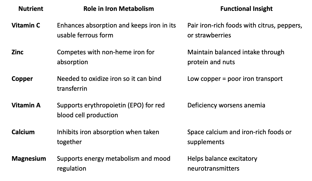 Iron rarely exists in isolation. It depends on a network of nutrients to function properly: