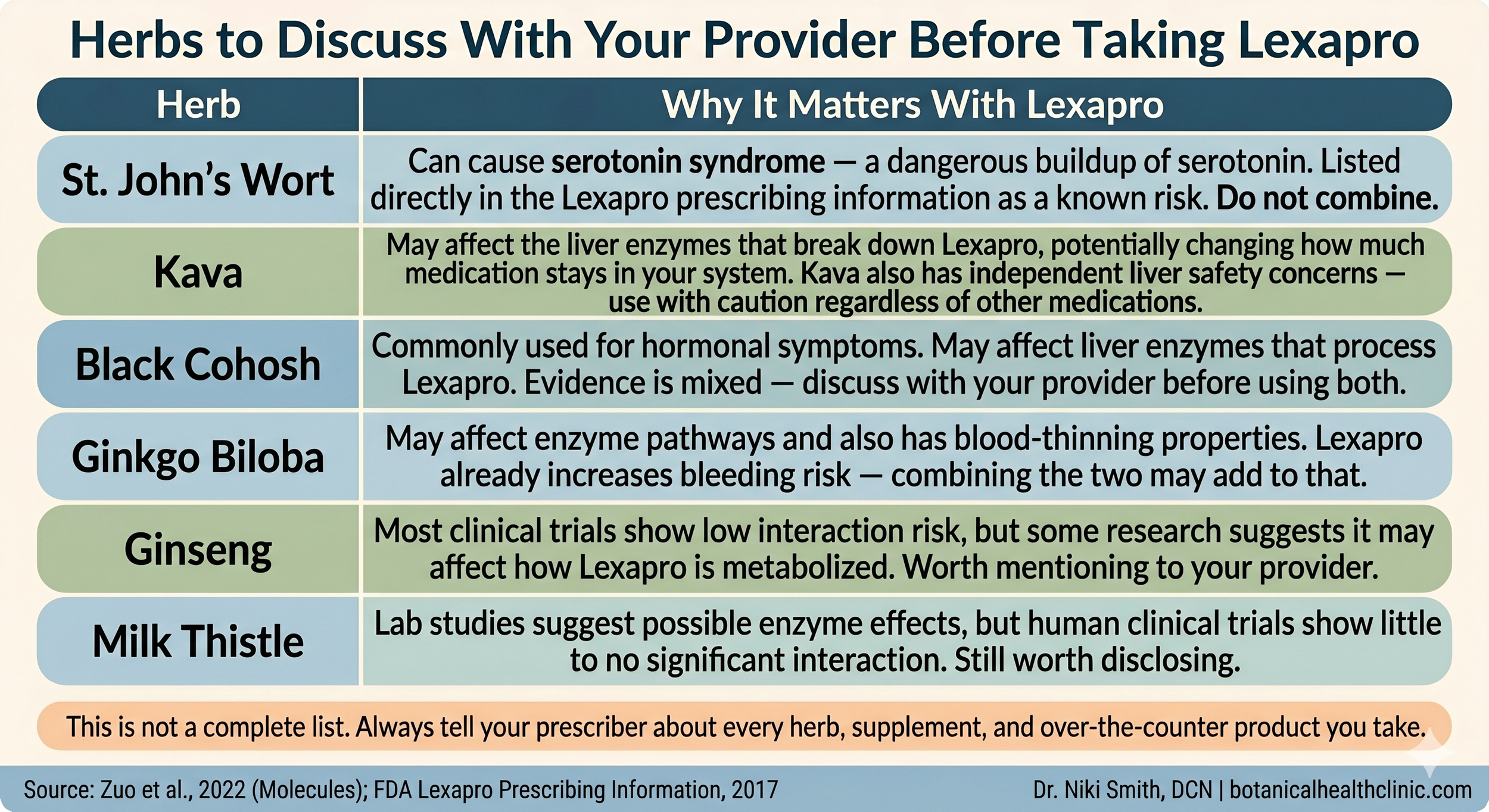 This is the most important herb caution with Lexapro. St. John's Wort is listed directly in the FDA prescribing information as a known serotonin syndrome risk. Do not combine with Lexapro. The risk is not theoretical (FDA Prescribing Information, 2017; Zuo et al., 2022).
