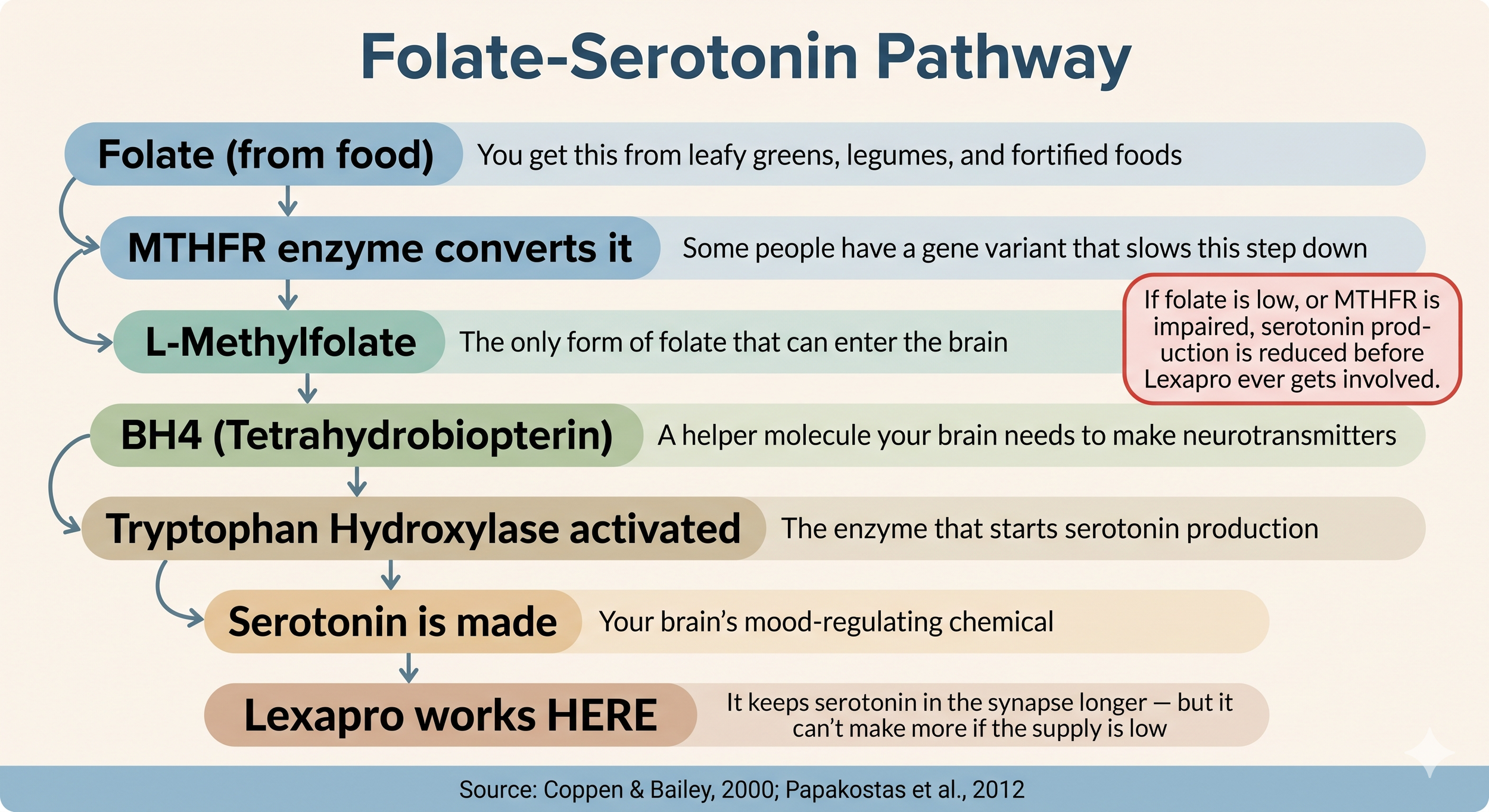 Lexapro tries to optimize the serotonin your brain has. But if your folate status is low, or if a genetic variant called MTHFR is impairing your ability to convert folate into its active form, your brain is not making enough serotonin for the medication to work with in the first place.